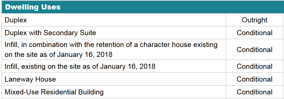To translate: Vancouver intentionally allows very little development without giving planners a discretionary subjective veto. Nearly anything other than a suburban house (but also many suburban houses!) is “conditional”, and for conditional uses the Director of Planning can impose any requirements they like. A typical zoning bylaw often looks like this: