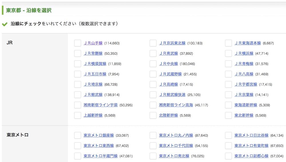 In this screen we’re just picking train lines to narrow down our search. The train lines are divided up by operator (JR, Tokyo Metro, and various private railways), and the numbers in parentheses show how many housing units are available for rent near each line. There is certainly some overlap between lines, but it’s still amazing to see so many train lines with thousands and thousands of homes listed nearby.