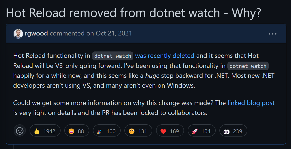That’s the crux of the matter; removing Hot Reload from dotnet watch would harm .NET in an area it needs to do much better in. The .NET team understands this, but the change was imposed on them by senior Developer Division leadership against strong internal opposition. This suggests that senior leadership does not understand .NET (bad) or prioritizes Visual Studio over the long-term health of .NET (worse).