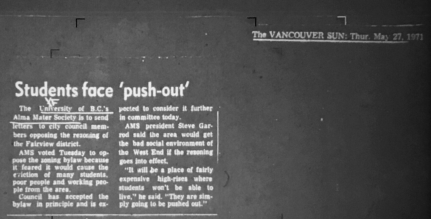 All articles were found on microfiche at the Central Vancouver Public Library in the Pacific Press newspaper clippings, subject “zoning”. Some clippings did not specify the newspaper, but the Vancouver Sun or Province are safe bets.
